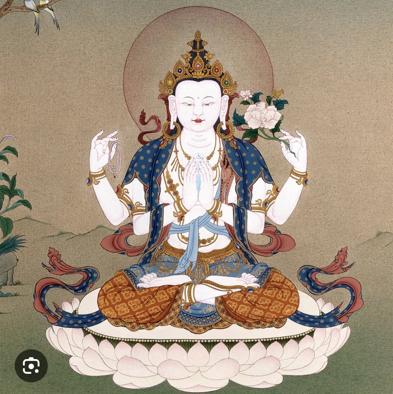 One of the main practices at the Dallas KTC is Chenrezig and its goal is to develop universal love and compassion for the benefit of all living beings. The formal sitting practice involves the use of chanting, visualization, mudras (physical gestures), and mantras to cultivate great love and compassion. The group Chenrezig practice done at our center doesn't have prerequisites. The mantra for Chenrezig is Om Mani Padme Hum.